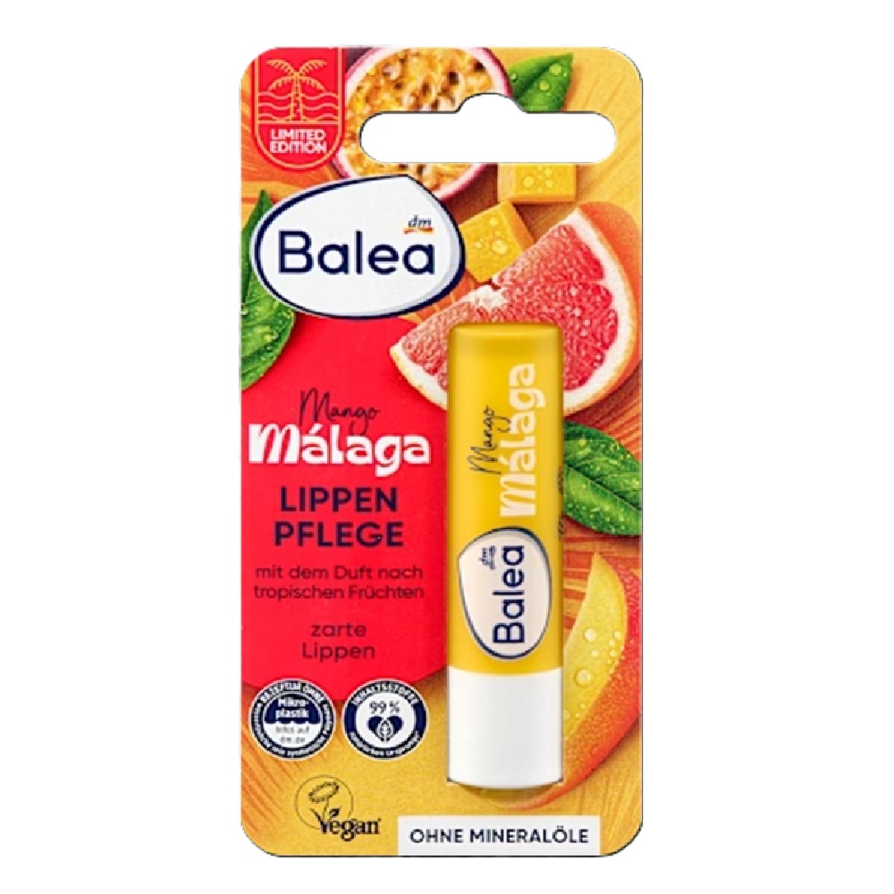 Το βάλσαμο χειλιών Mango Malaga της Balea περιποιείται τα χείλη με μια πλούσια σύνθεση που συνδυάζει βούτυρο καριτέ και βιολογικό λάδι καρύδας.