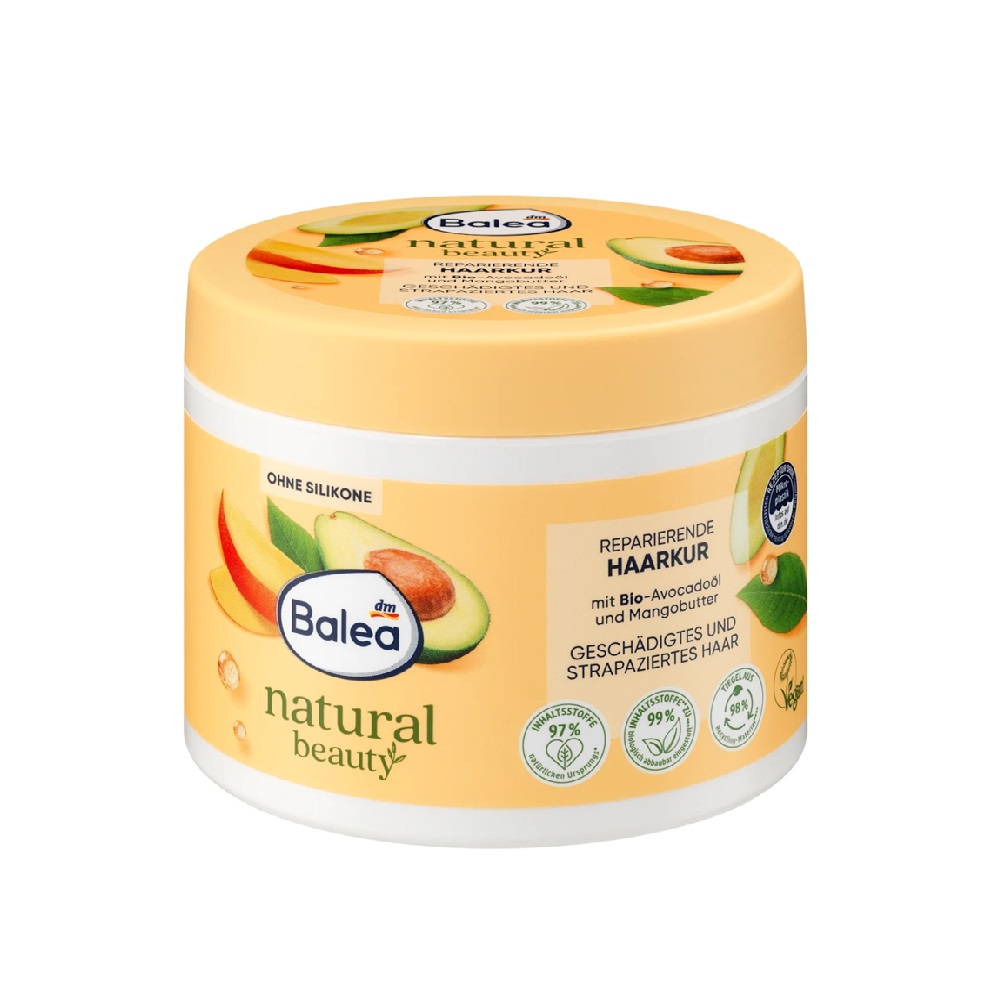 Η επανορθωτική θεραπεία μαλλιών Balea Natural Beauty με βιολογικό λάδι αβοκάντο και βούτυρο μάνγκο φροντίζει εντατικά τα ταλαιπωρημένα και εύθραυστα μαλλιά χωρίς να τα βαραίνει. Η πλούσια σύνθεσή της θρέφει τα μαλλιά, αφήνοντάς τα απαλά και ελαστικά, βελτιώνοντας έτσι το χτένισμα.